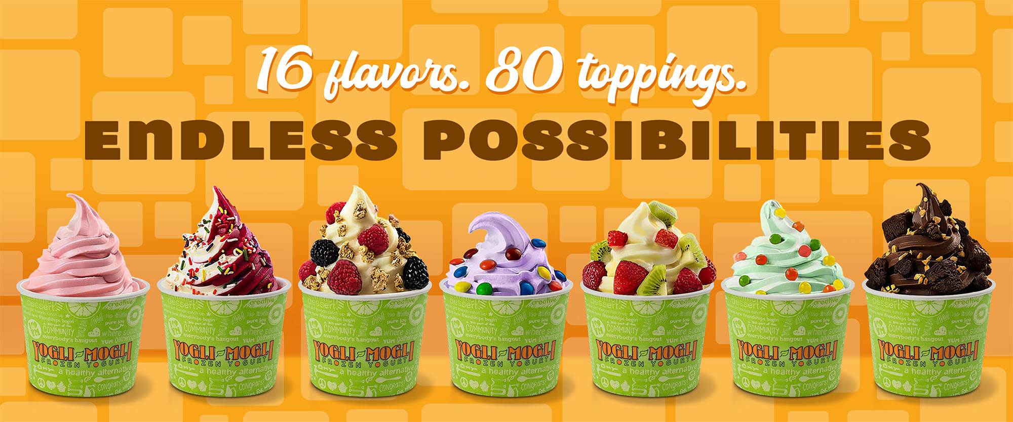 Choose from 16 delicious frozen yogurt and sorbet options with new, exciting flavors swirling every month.